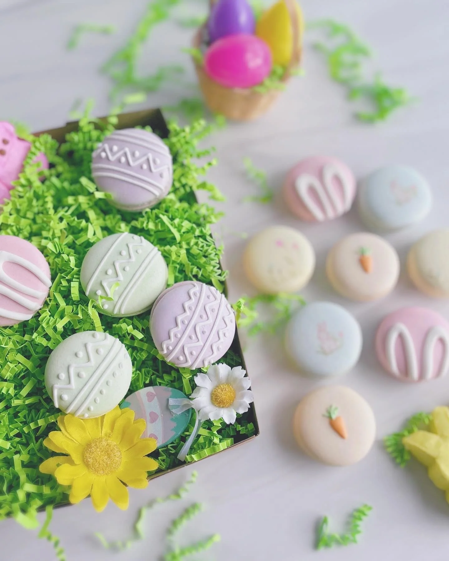 These pastel macarons come with assorted delicate spring designs such as bunnies, carrots, flowers, easter eggs, and more. You will be able to select your flavors upon adding to cart.