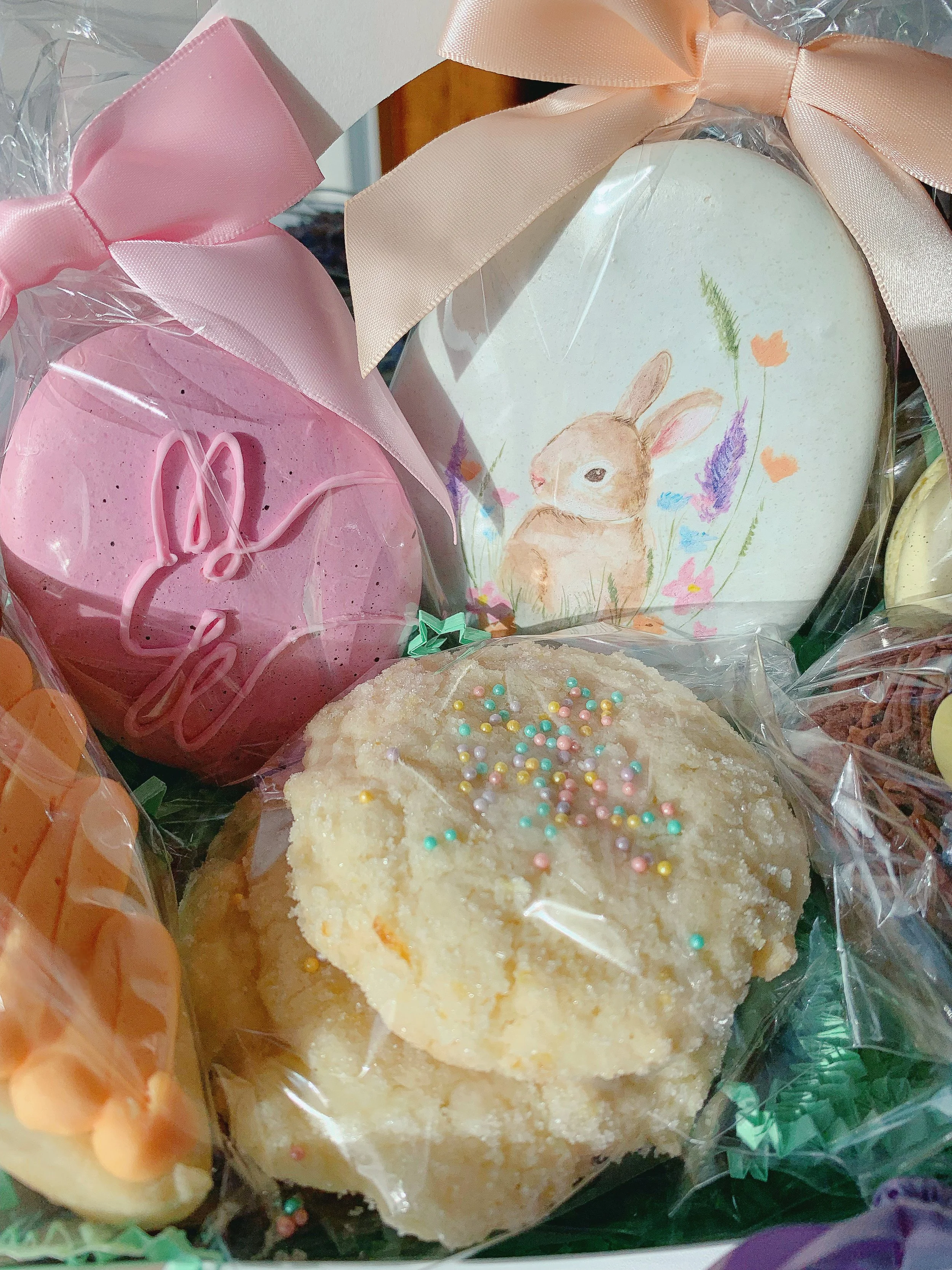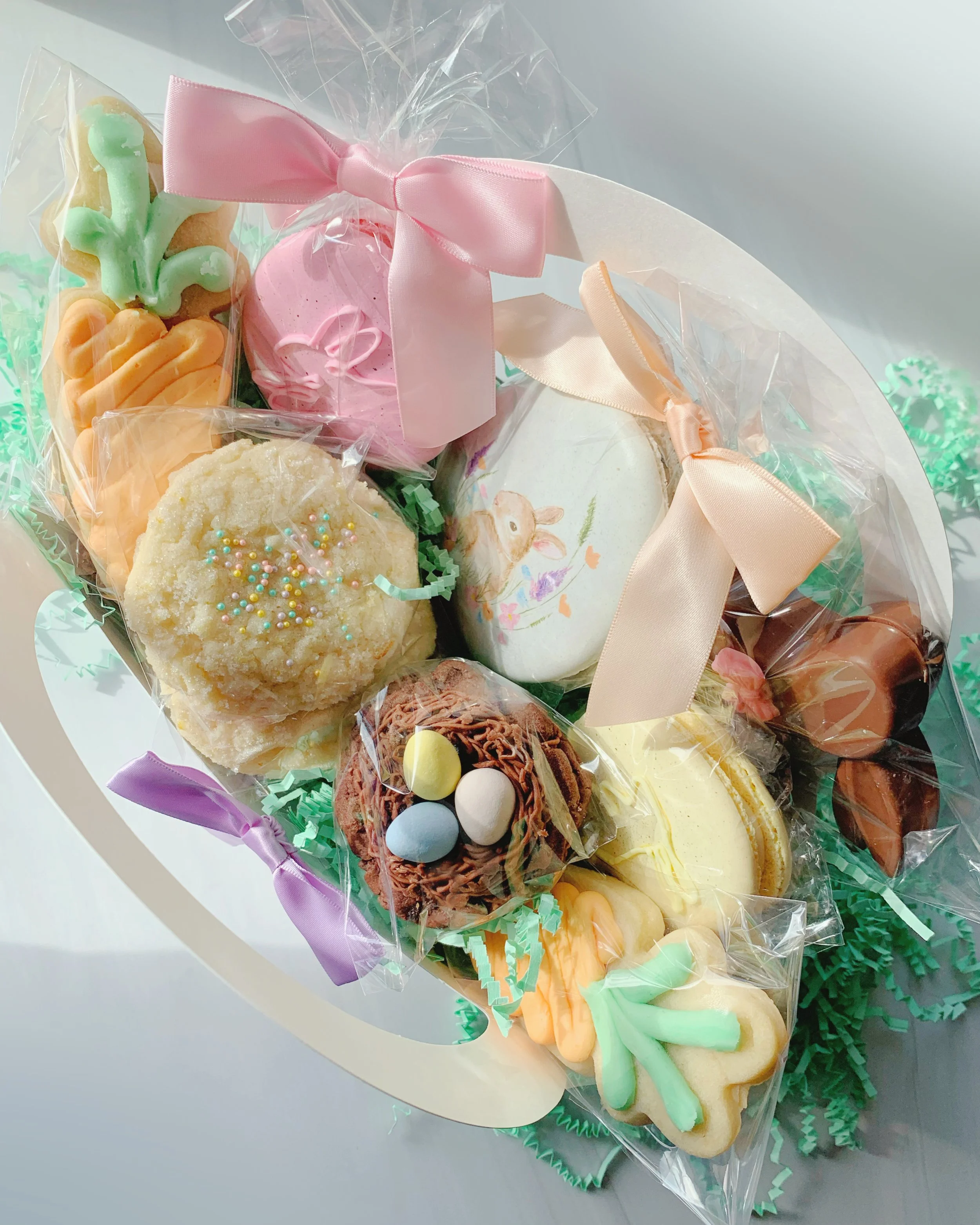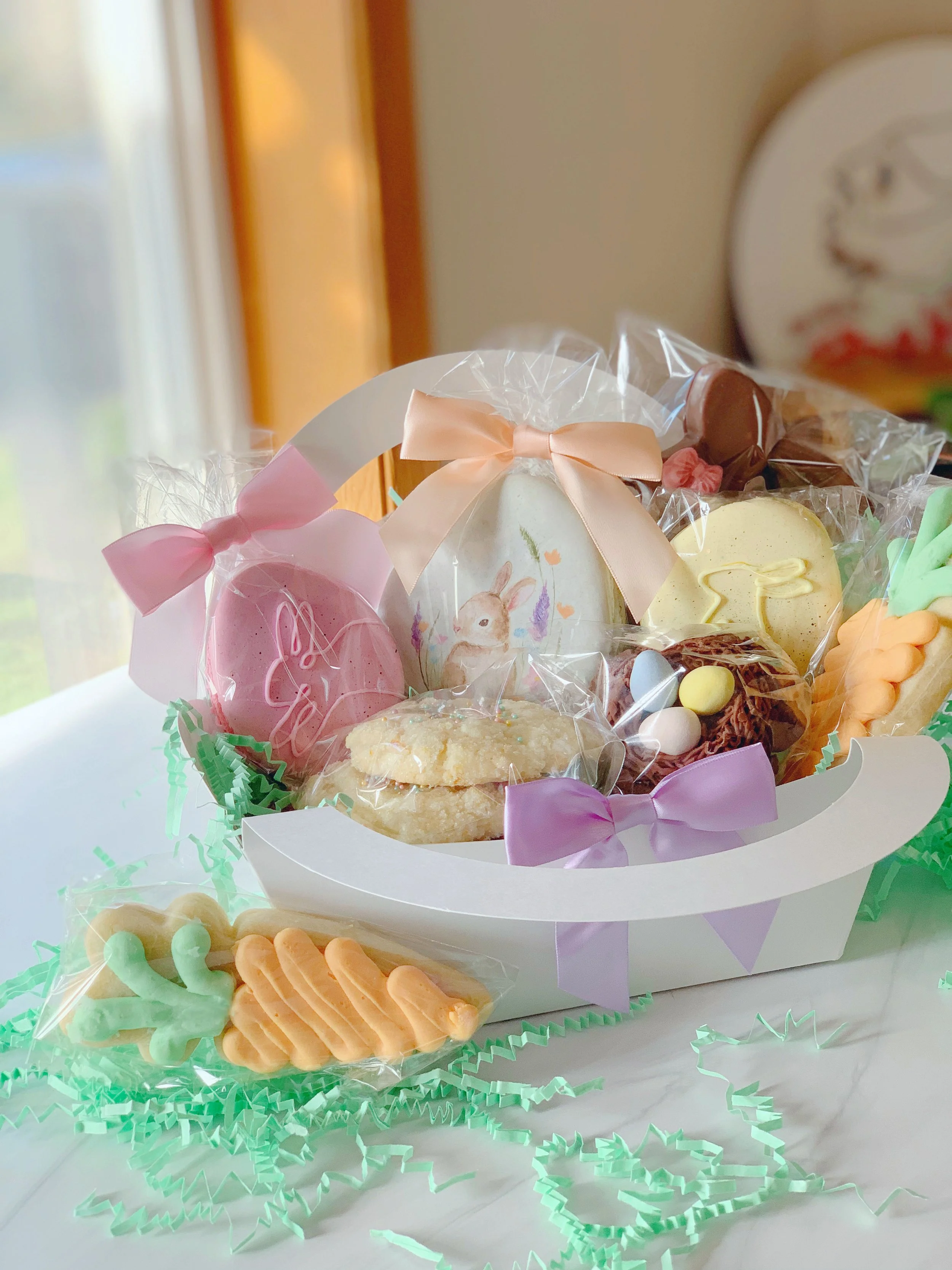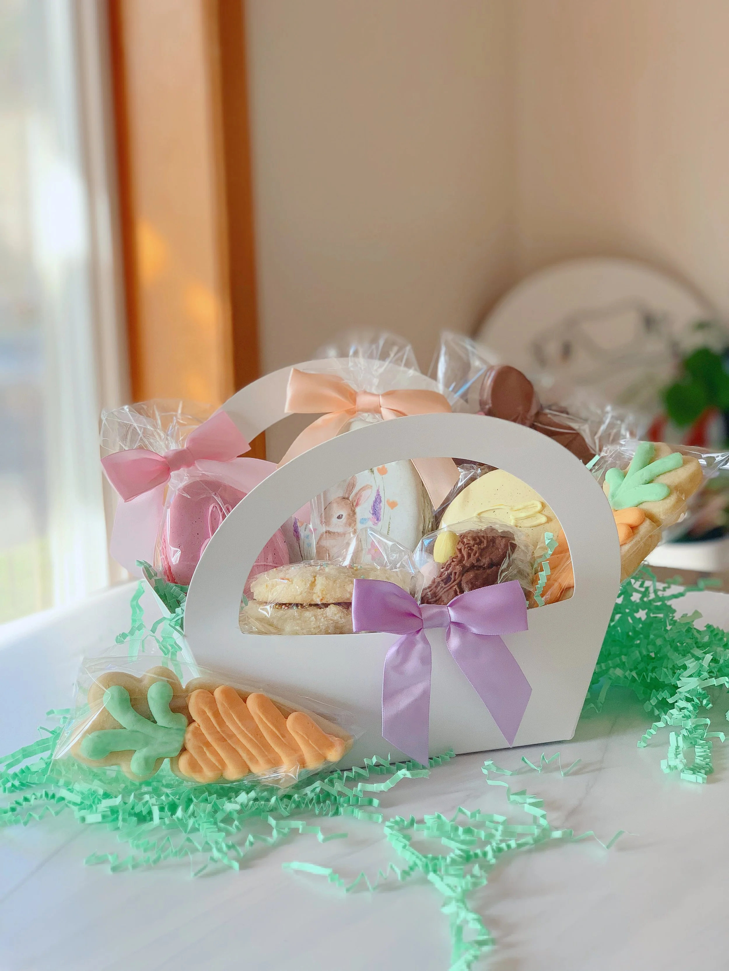 A beautiful and delicious Easter basket full of Frankie’s baked goods! Comes in a white paper basket on a bed of paper grass, tied with a bow.